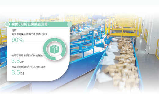 根據(jù)5月份包裹抽查測(cè)算,目前,我國(guó)電商快件不再二次包裝比例達(dá)90%,使用可循環(huán)包裝的郵件快件達(dá)3.8億件,回收復(fù)用質(zhì)量完好的瓦楞紙箱達(dá)3.5億個(gè)。