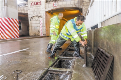 為應(yīng)對此次強(qiáng)降雨,天津市環(huán)衛(wèi)部門16000名環(huán)衛(wèi)工人奮戰(zhàn)在第一線,753部作業(yè)車輛全部在崗,及時對城市環(huán)境進(jìn)行清整作業(yè),保障市民安全出行。圖為河西區(qū)環(huán)衛(wèi)工在樂園道等區(qū)域排水。 記者 龐劍 攝