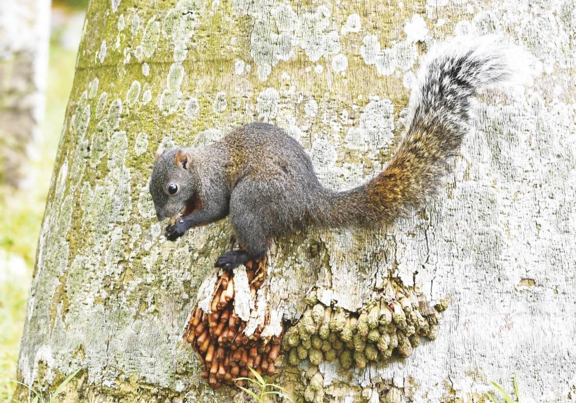 公園里一陣秋雨過后,松鼠出來覓食。 記者 梁楓 攝