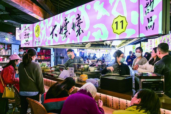 市集分為生鮮區(qū)、小食區(qū),共有經(jīng)營戶79戶。生鮮區(qū)按照商品種類設(shè)置交易區(qū),分別為冷凍、鮮肉、水產(chǎn)、豆制品、蔬菜、南北貨、綜合7大類,補(bǔ)齊城市公共設(shè)施短板,滿足周邊居民生活所需。小食區(qū)內(nèi),集中的特色餐飲縮短了游客們熟悉一座城市的時間。糖水鋪、茶館、特色小吃應(yīng)有盡有;新增酒肆、茶館等15個特色檔口,檔口均設(shè)置“沿街門”及“市集門”,前后貫通,增加了生動而通透的視覺體驗(yàn)。