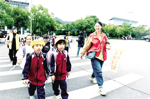 吉首市交警女子護(hù)學(xué)崗隊(duì)員護(hù)送學(xué)生過馬路。 楊賢清 攝