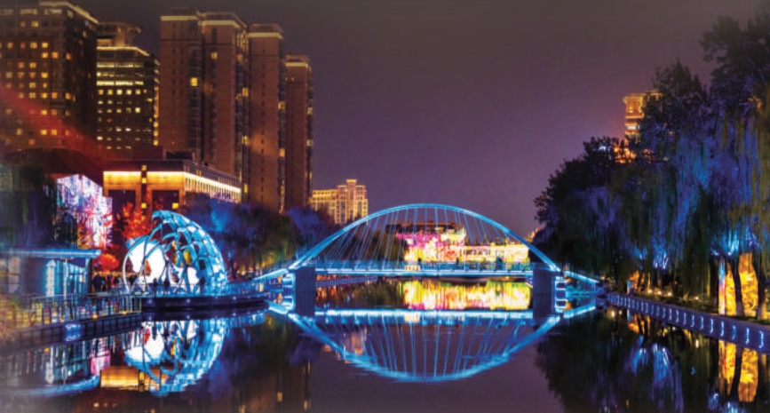 夜品中國風(fēng)。在通惠河的高碑店湖,古風(fēng)建筑倒映在波光粼粼的水面上,七彩菩提古樹、平津古閘、滕隆閣等燈帶構(gòu)成了“御水金環(huán)”夜間景觀,把漕運故事娓娓道來。