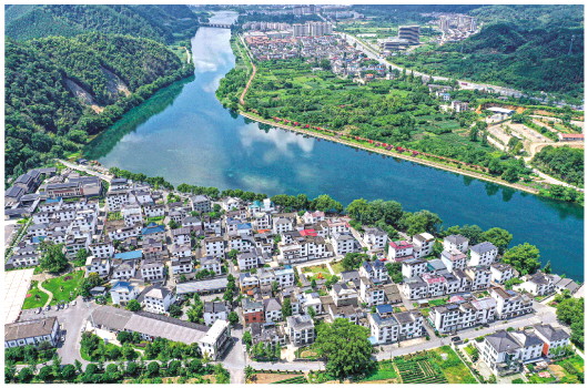 ▲在浙江省衢州市開化縣拍攝的錢塘江源頭河——馬金溪沿岸金星村。當?shù)刈畲笙薅鹊乇A袅饔驗┑貫┝?,將“固?綠岸+慢道”結(jié)合建設(shè),帶動鄉(xiāng)村旅游和民宿經(jīng)濟大力發(fā)展(2023年8月2日攝)。新華社記者 黃宗治 攝