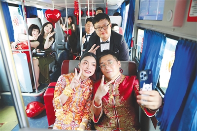 “結(jié)婚當(dāng)天,大家需要張羅的事很多,需要早起,會擔(dān)心司機(jī)疲勞駕駛,大巴車剛好就解決了這個煩惱?!比ツ?2月28日結(jié)婚的李媛媛也選擇了大巴車迎親。她說,現(xiàn)在年輕人結(jié)婚,追求婚禮簡約、熱鬧,大巴車安全又環(huán)保就成為他們迎親車輛選擇的重要考慮之一??吹揭灿泻芏嘈氯诉x用大巴車迎親,她和丈夫胡先生也有了嘗試的想法。誰料想,這個提議得到雙方父母的贊同?!凹依锏挠H戚都很贊同,大家可以坐在大巴車內(nèi)互動交流,氛圍非常好?!崩铈骆抡f,與傳統(tǒng)迎親車隊(duì)相比,租用大巴車更加經(jīng)濟(jì)實(shí)惠。