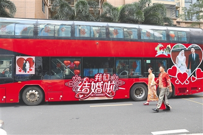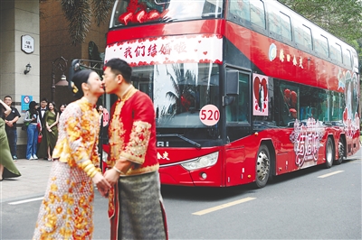 “我覺得這樣的迎親方式既有創(chuàng)意也有面子?!毙履飶堣凑f,與傳統(tǒng)婚車車隊(duì)相比,大巴車迎親更符合年輕人追求時尚、追求創(chuàng)意的心理,迎親路上親屬可全程陪同,舒心而不失浪漫、簡約而不失喜慶?!耙惠v雙層巴士可以坐30人,可以服務(wù)12小時,早晨迎親和晚宴都可以使用?!睆堣凑f,大巴車可以根據(jù)乘坐人數(shù)選用單層或雙層巴士,行駛路線也可以專門定制,既方便也省心。