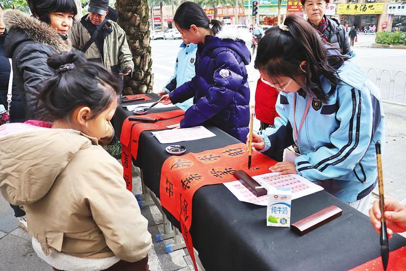 南寧市東葛路小學與東葛路社區(qū)聯(lián)合開展黨員進社區(qū)服務群眾志愿活動,黨員教師、學生代表紛紛執(zhí)筆,現(xiàn)場為社區(qū)居民書寫春聯(lián)和“?!弊郑屔鐓^(qū)居民提前感受節(jié)日的溫暖。(晏維寧 攝)