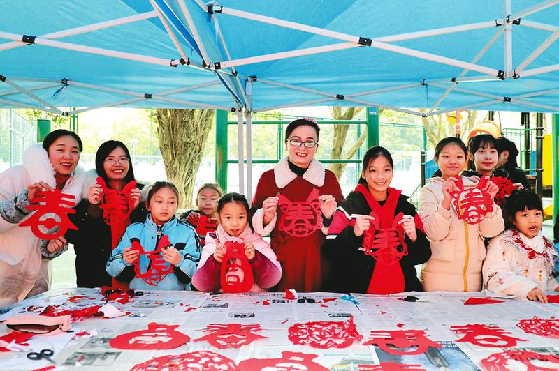 南寧市榮和實驗學校攜手社區(qū)、物業(yè)開展“欣欣向榮迎新年 文明實踐樹新風”志愿服務活動,黨員教師、少先隊員代表現(xiàn)場揮毫潑墨書寫春聯(lián)和“福”字、剪窗花,表達對新年的美好祝愿和對美好生活的向往。(嚴文娟 攝)