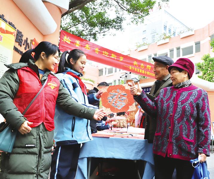 春聯(lián)寓意著人們對美好生活的向往和祝福,既是一種傳統(tǒng)文化的表達,也是一種節(jié)日氛圍的營造,讓人們在新的一年里充滿喜悅和希望。連日來,南寧市各中小學利用寒假開展形式多樣的活動,組織師生或走上街頭參加志愿服務活動,為社區(qū)群眾送上新春的祝福,或在家寫春聯(lián)和“福”字,為即將來臨的新春佳節(jié)增添濃濃的喜慶氛圍。