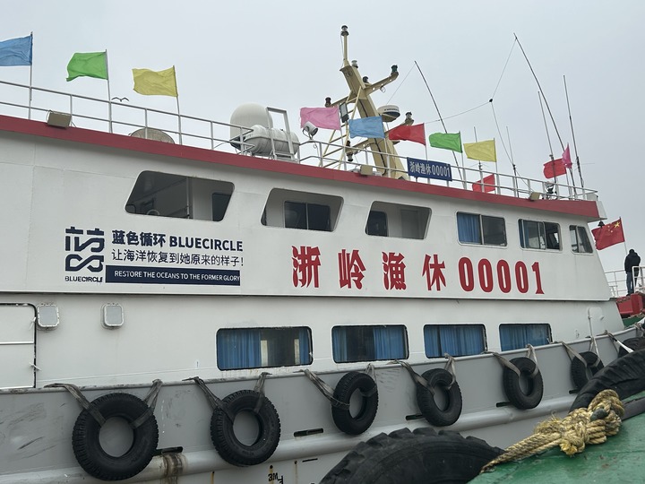 臺州溫嶺一艘休閑漁船上印著“藍(lán)色循環(huán)”的標(biāo)志。記者 黃筱 攝