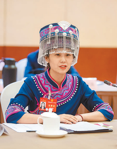 湖北代表團(tuán)全體會(huì)議上,張瓊麗代表發(fā)言。人民網(wǎng)記者 翁奇羽 攝