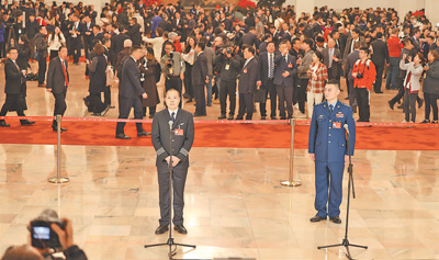 3月5日,十四屆全國人大二次會(huì)議首場(chǎng)“代表通道”采訪活動(dòng)舉行,代表在接受采訪。本報(bào)記者 蔣雨師 攝
