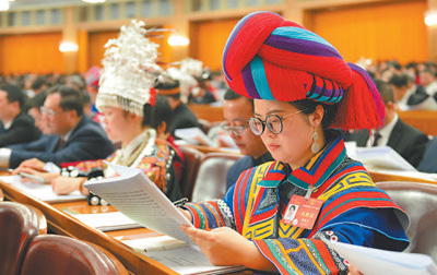 3月5日,十四屆全國人大二次會(huì)議在北京人民大會(huì)堂開幕,代表認(rèn)真審議政府工作報(bào)告。本報(bào)記者 陳斌 攝