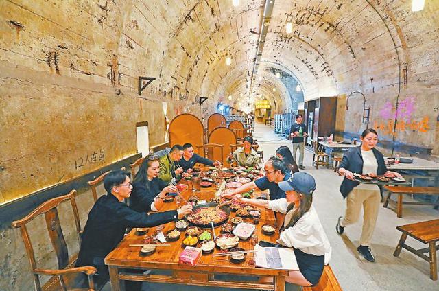 防空洞火鍋 重慶胡家?guī)r文旅小鎮(zhèn)的地下火鍋店,占地面積4500平方米,能擺放208張餐桌,是目前重慶最大的地下火鍋店。
