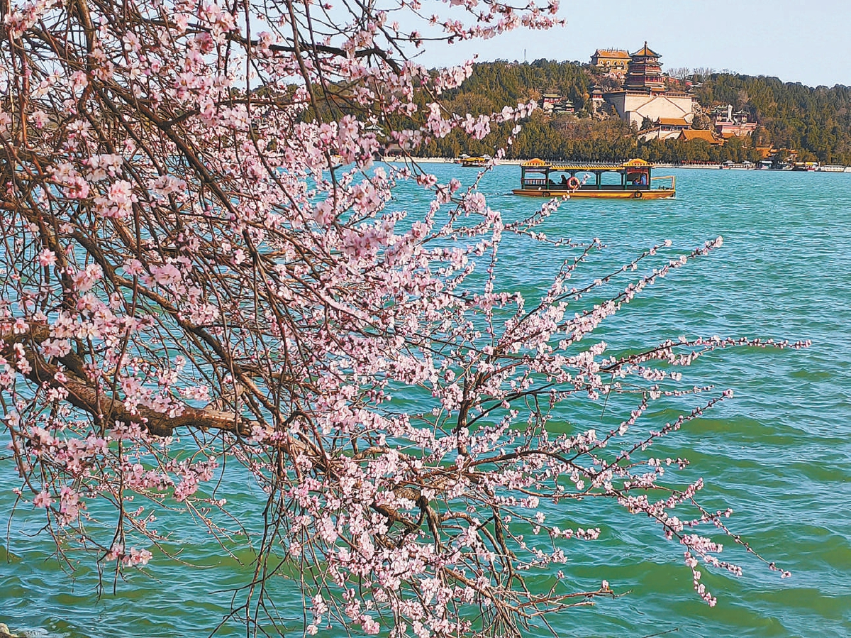 陽春三月,頤和園西堤的百余株山桃樹開始“桃花朵朵開”。頤和園西堤是京城賞春花的主要“打卡地”之一。(攝影 龐錚錚)