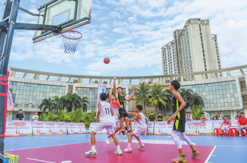 2023年10月29日,第四屆“椰青杯”青少年籃球比賽現(xiàn)場,參賽小隊(duì)員正在激烈地進(jìn)行比賽對(duì)抗。