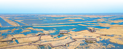沿路前行,柳樹(shù)伸展著柔嫩的枝條;木棧橋兩側(cè),蘆葦隨風(fēng)搖曳。淺灘之上,鷗鳥(niǎo)群集,鳴叫聲此起彼伏。