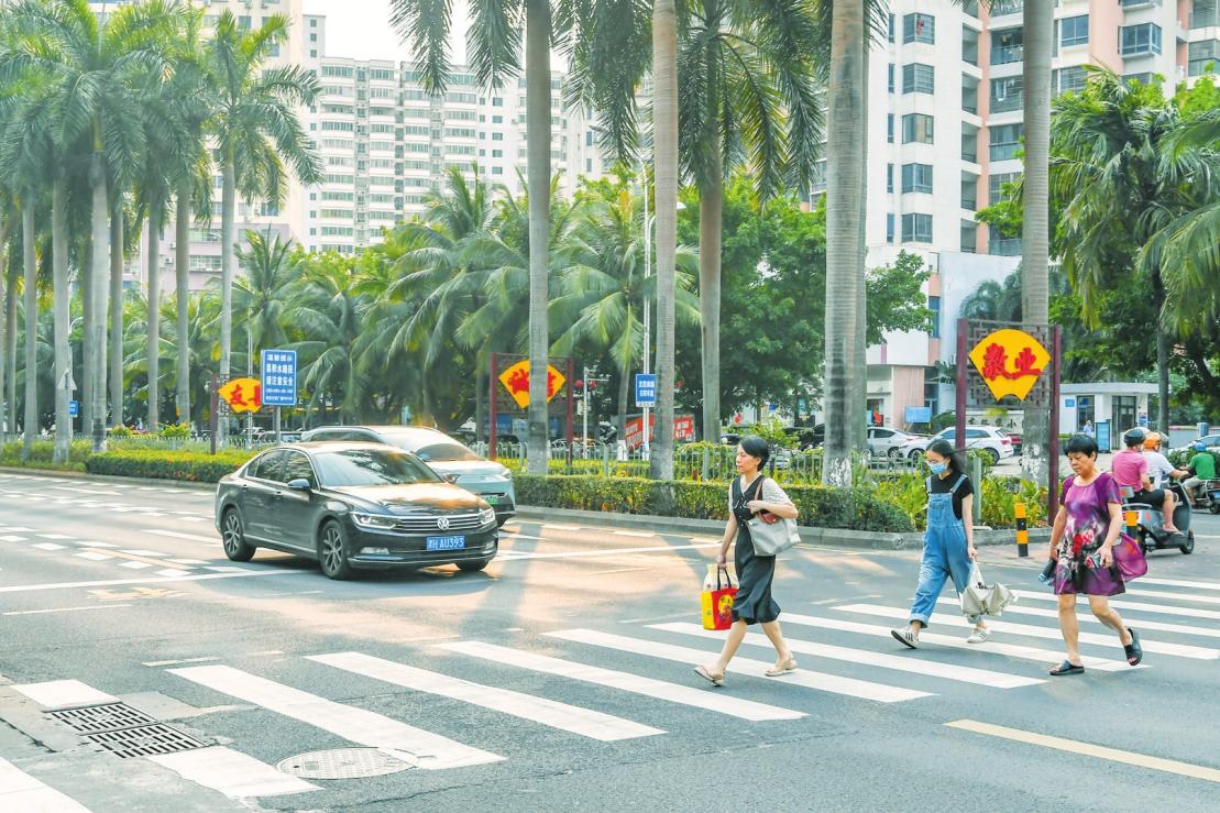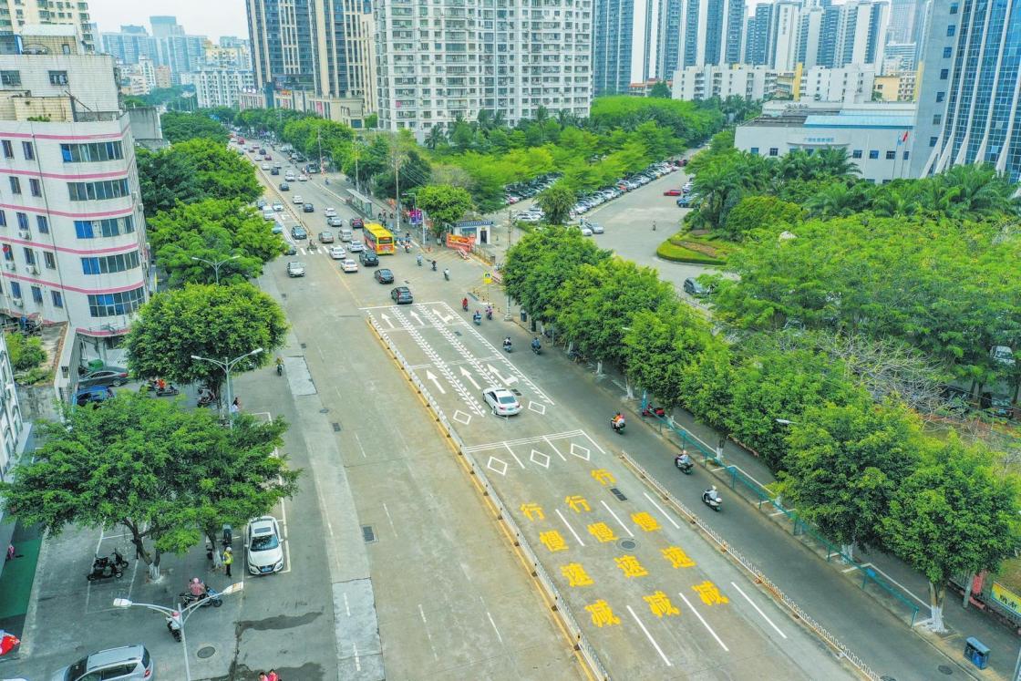 4月24日,俯瞰南沙路海南電視臺路口,新式斑馬線已更新完成。