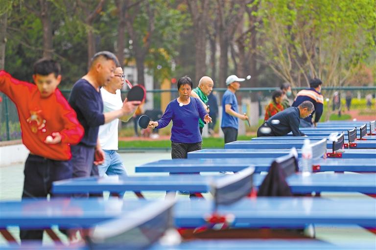 西安城市運(yùn)動(dòng)公園是市民參與全民健身的重要場所之一。圖為5月7日,市民在西安城市運(yùn)動(dòng)公園健身廣場打乒乓球。 記者 肖陽熠 攝