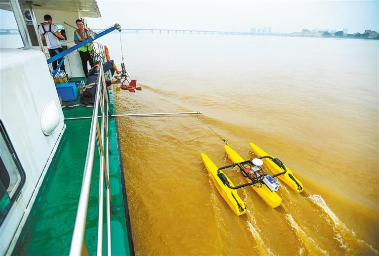 6月19日,江西省樟樹市水文水資源監(jiān)測大隊隊員利用走航式ADCP進行流量測驗,為及時發(fā)布洪水預(yù)警提供科學(xué)依據(jù)。周亮 攝(中經(jīng)視覺)