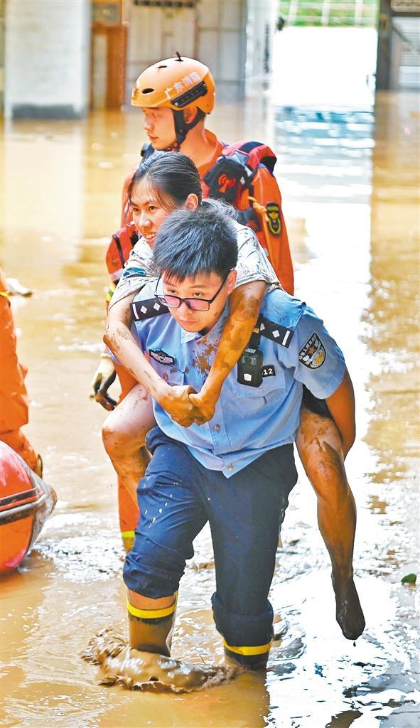 6月17日,廣東省梅州市蕉嶺縣新鋪派出所民警在轉(zhuǎn)移受災(zāi)群眾。何志林 攝(中經(jīng)視覺)