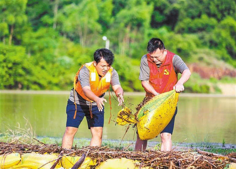 7月28日,福建省南安市金淘鎮(zhèn)毓南村躍進水庫,當?shù)攸h員干部在搬運溢洪道的沙袋,全力保障轄區(qū)群眾生命財產(chǎn)安全。謝貴明攝(中經(jīng)視覺)