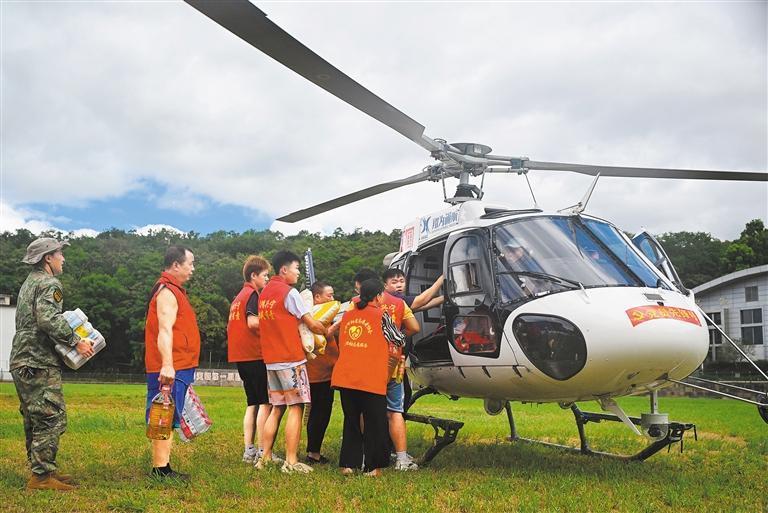 7月30日,湖南省資興市第一中學球場,志愿者在運送物資,“黨員先鋒號”直升機趕赴多個村組進行空投。郭立亮攝(中經(jīng)視覺)