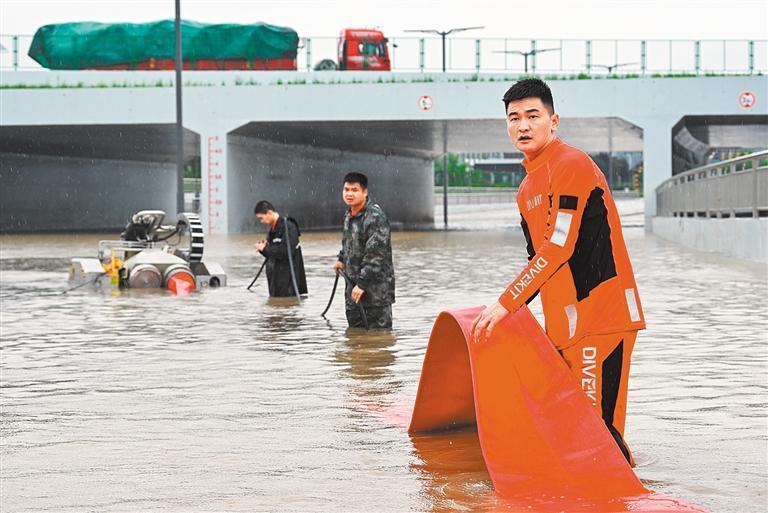 7月30日,山西省運城市應急救援大隊全體黨員干部堅守一線,操作龍吸水設備進行排水工作,確保居民出行安全。常奇攝(中經(jīng)視覺)