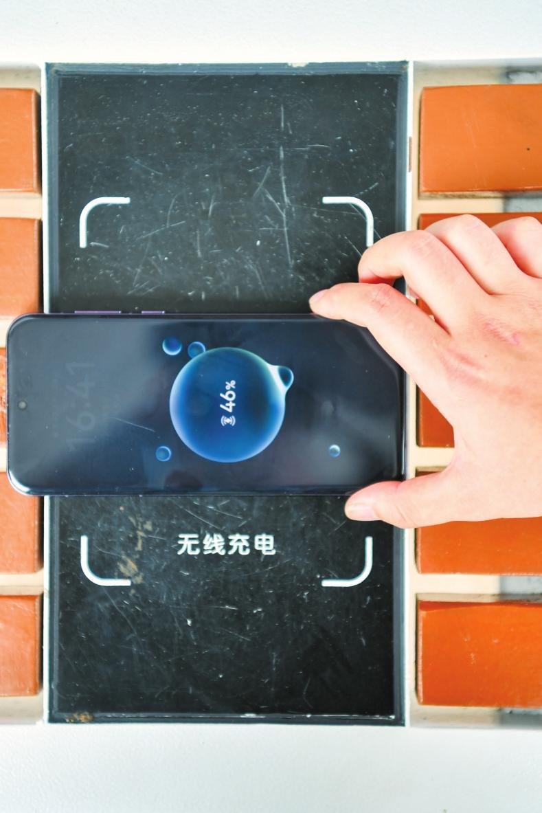 市民在智能公交站臺,使用座椅旁的無線充電器為手機充電。記者 孫士杰 攝