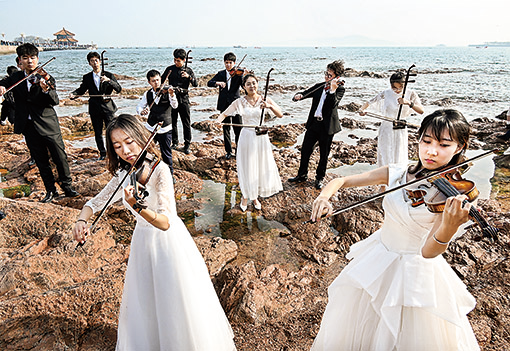 中國海洋大學(xué)藝術(shù)系學(xué)生在青島市市南區(qū)棧橋景區(qū)演奏(四月十八日攝)。