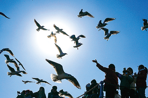 游客在青島市市南區(qū)棧橋景區(qū)觀賞海鷗(一月二十四日攝)。