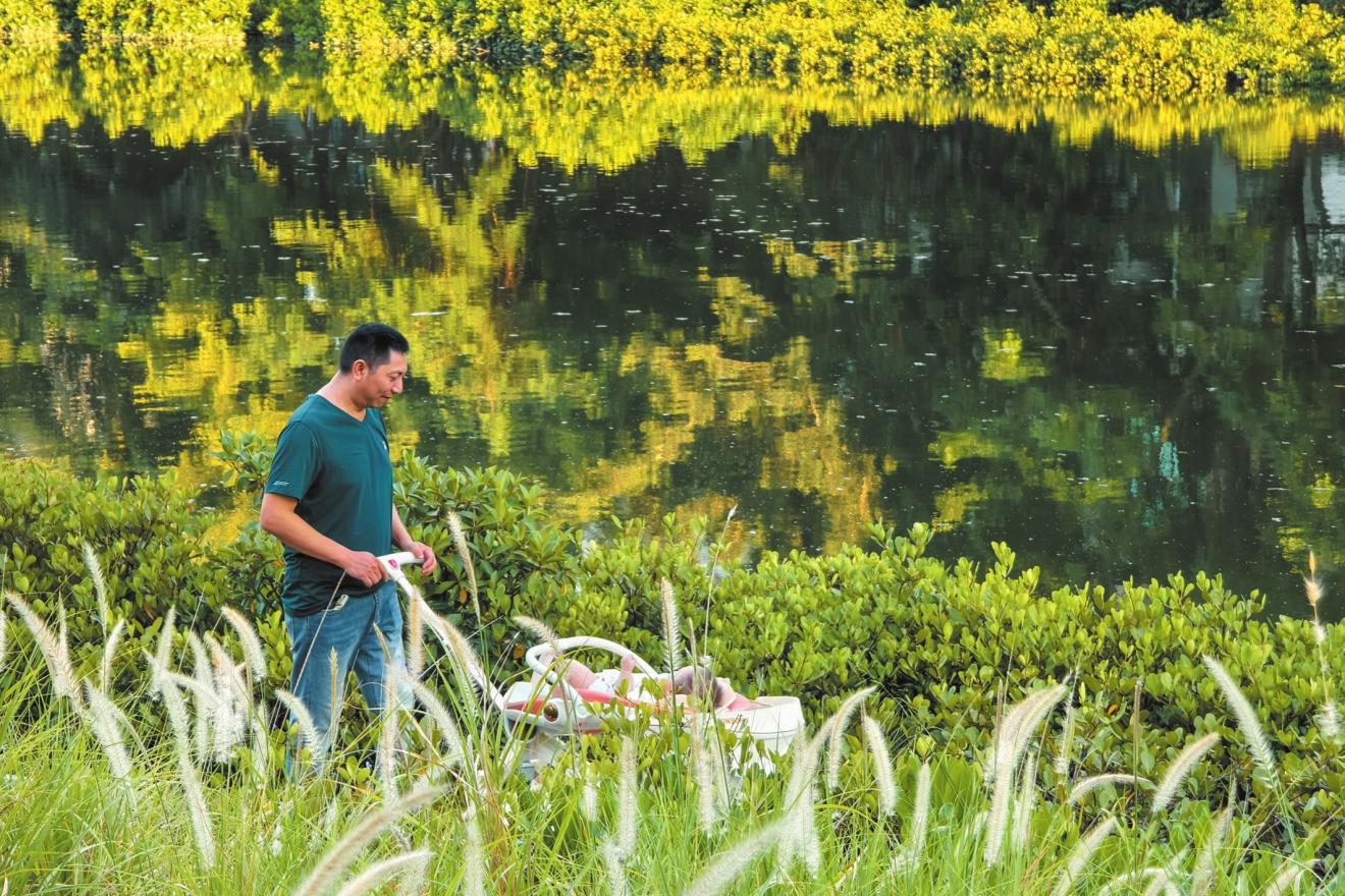 近日,市民在鴨尾溪濕地公園親水棧道上散步。