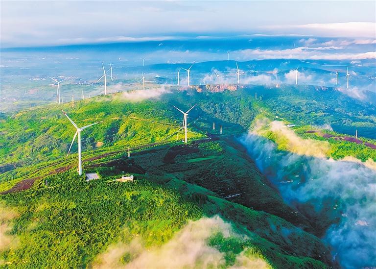 8月6日,河南省宜陽縣錦屏山生態(tài)園,滿山翠綠映襯著一臺臺新能源風(fēng)力發(fā)電機(jī)。該縣立足生態(tài)優(yōu)先、綠色發(fā)展理念,建造了27000畝人造森林公園,把昔日荒山打造成可持續(xù)循環(huán)發(fā)展的綠色經(jīng)濟(jì)帶。田義偉 攝(中經(jīng)視覺)