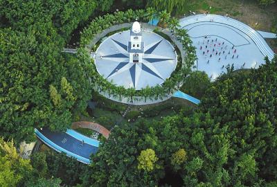 俯瞰成都市麗都運(yùn)動(dòng)公園,健身步道、休閑小廣場(chǎng)都隱沒在綠蔭里。