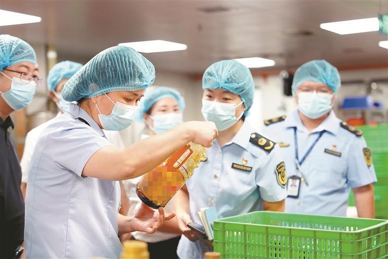 寶安市場(chǎng)監(jiān)管局執(zhí)法人員在學(xué)校檢查調(diào)味品質(zhì)量。