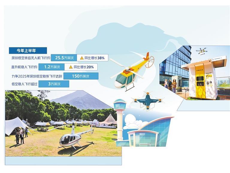 當前,深圳低空應(yīng)用場景已覆蓋空中通勤、低空觀光、物流配送、城市治理、應(yīng)急救援等各個領(lǐng)域,僅在物流配送方面,便涉及快遞配送、餐飲配送、醫(yī)療運輸、生鮮冷鏈等。今年上半年,深圳低空載貨無人機飛行量、新增貨運航線、載人飛行量、運送人數(shù)規(guī)模均居全國前列。其中,低空貨運無人機飛行約25.5萬架次,同比增長38%;直升機載人飛行約1.2萬架次,同比增長20%。目前,深圳正進一步拓展應(yīng)用服務(wù),力爭2025年低空載貨飛行達到150萬架次,低空載人飛行超過3萬架次。