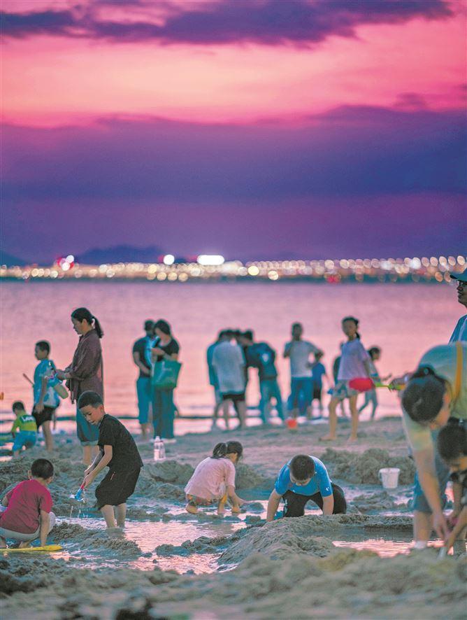 落日余暉千百態(tài),瀏江古渡荻花洲。傍晚海風習習的海灘上,露營的家庭、玩沙的孩童、拍夕陽的情侶,都為愜意的海灣悠閑添上了幾分松弛感。