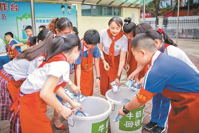在垃圾分類的可回收物中,校園奶盒回收價值低,深圳進一步探索建立低值可回收物回收鏈路。2021年9月,深圳市將垃圾分類與校園實踐教育相結(jié)合,發(fā)起校園奶盒資源回收行動。