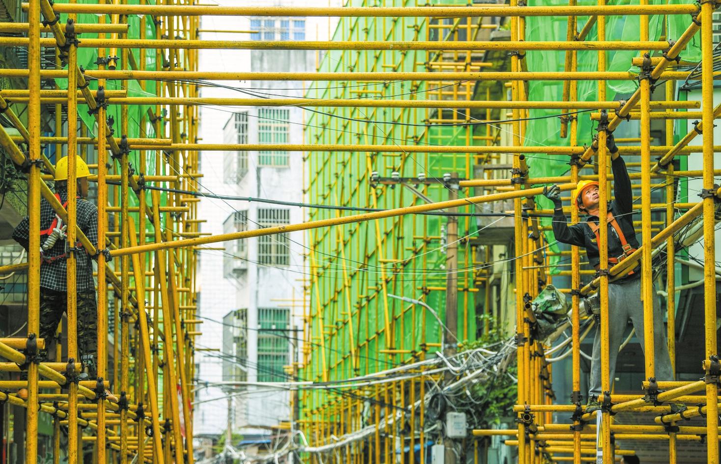 日前,在??隍T樓歷史文化街區(qū)少史巷內(nèi),施工人員在搭建腳手架。記者 康登淋 攝