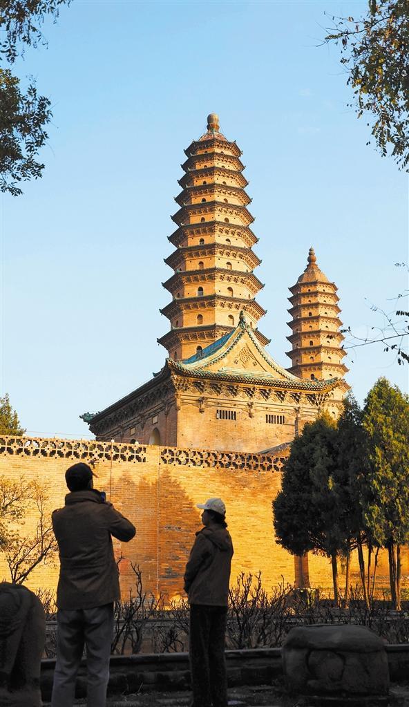 11月6日,游客在太原市雙塔博物館打卡。該館因兩座巍峨的古塔而聞名。