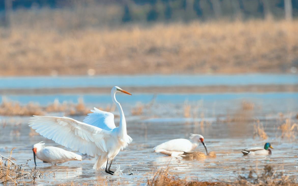 1月5日,朱鹮和白鷺等鳥類在咸陽市細(xì)柳營濕地覓食。2024年10月,24只朱鹮在此野化放飛,目前它們已基本適應(yīng)這里的環(huán)境。周季 攝