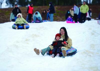 市民游客在浦口區(qū)水墨大埝的金陵冰雪大世界體驗(yàn)冰雪游樂(lè)項(xiàng)目,享受冰雪樂(lè)趣。