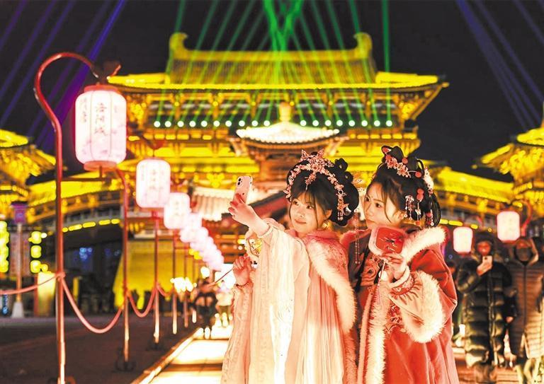 2月12日,身著漢服的游客在河南省洛陽(yáng)市隋唐洛陽(yáng)城九洲池神都上元燈會(huì)游園賞燈。張光輝 攝(中經(jīng)視覺)