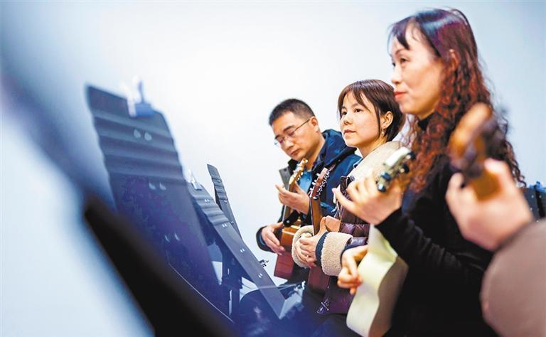 2月24日晚,浙江省湖州市長(zhǎng)興縣工人文化宮,企業(yè)職工在學(xué)習(xí)演奏尤克里里。譚云俸 攝(中經(jīng)視覺)