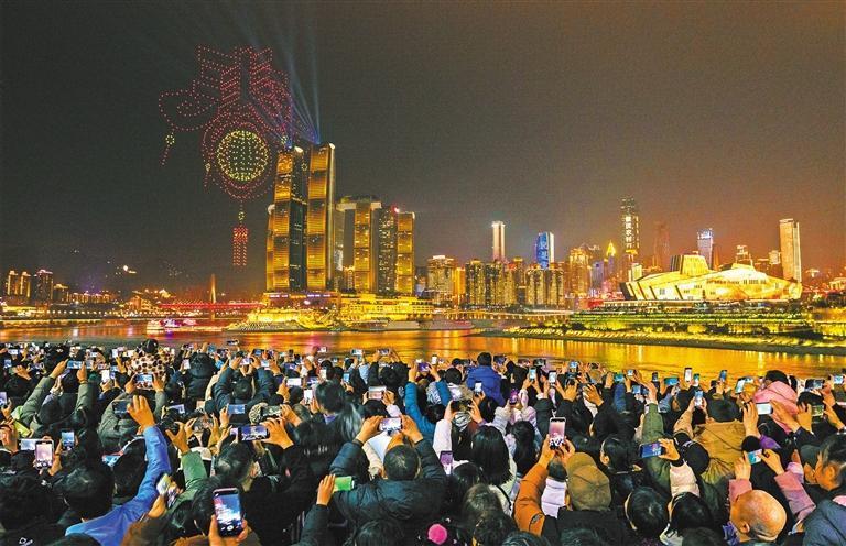 2月11日,重慶,市民在長(zhǎng)江邊觀看無(wú)人機(jī)表演。重慶的“無(wú)人機(jī)燈光表演”將科技創(chuàng)新融入傳統(tǒng)節(jié)日,不僅呈現(xiàn)出視覺盛宴,也為假日消費(fèi)增添了新動(dòng)能。劉嵩 攝(中經(jīng)視覺)