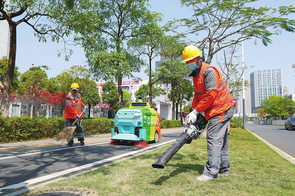 3月19日,在深圳市坪山區(qū)石井街道,環(huán)衛(wèi)機(jī)器人與環(huán)衛(wèi)工人進(jìn)行協(xié)同作業(yè)。在深圳市坪山區(qū)石井和坑梓兩個(gè)街道,道路上不時(shí)能看到彩色的環(huán)衛(wèi)機(jī)器人出沒(méi)。它們能夠自主識(shí)別垃圾、自動(dòng)返回基站倒垃圾并加水,與環(huán)衛(wèi)工協(xié)同配合完成復(fù)雜道路清掃工作。(新華社記者 毛思倩攝)