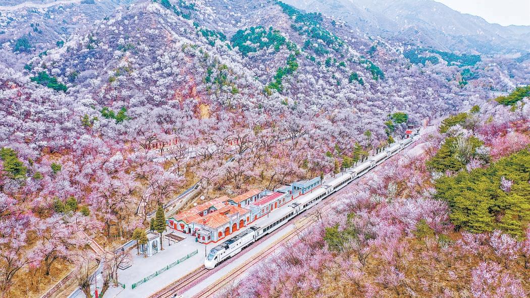 北京市郊S2線鐵路穿梭在爛漫花海間,給進京旅客留下美好的“北京第一印象”。記者 潘之望 攝
