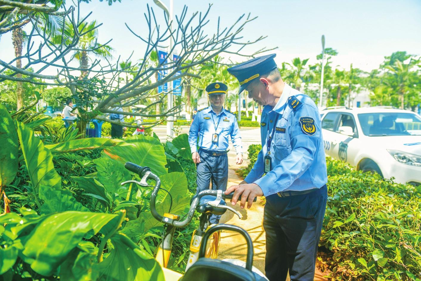 生態(tài)環(huán)境保護行政執(zhí)法支隊主要負責(zé)巡控海色路區(qū)域,維持通行秩序,為市民指引路線,清理流動攤販,規(guī)范共享單車和電動自行車的停放秩序。(鄧宇)