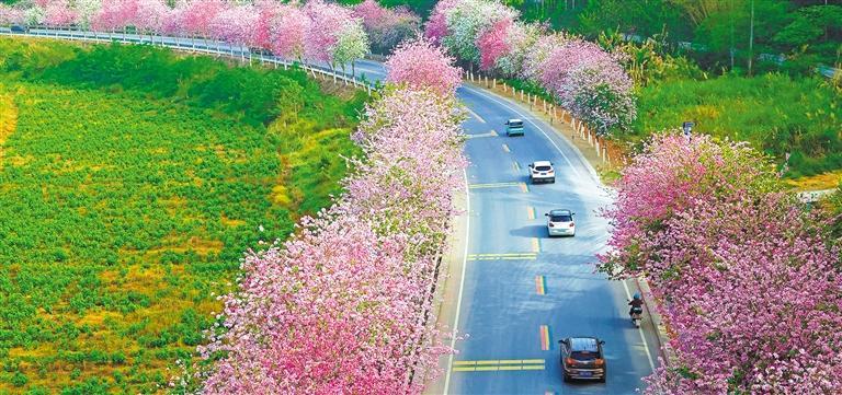 4月13日,廣西梧州市蒙山縣蒙山鎮(zhèn)北樓村公路兩旁的紫荊花競(jìng)相綻放。吳廣升攝(中經(jīng)視覺)
