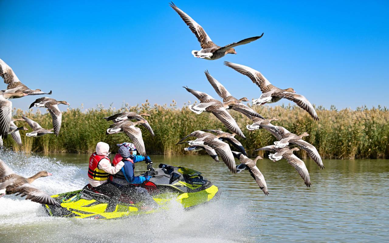 游客在沙湖景區(qū)乘坐快艇時大雁在一旁飛翔。當(dāng)日是國慶假期的第二天,許多游客來到寧夏石嘴山市沙湖景區(qū),感受沙漠與湖泊相依的獨(dú)特景觀。新華社記者 馮開華 攝
