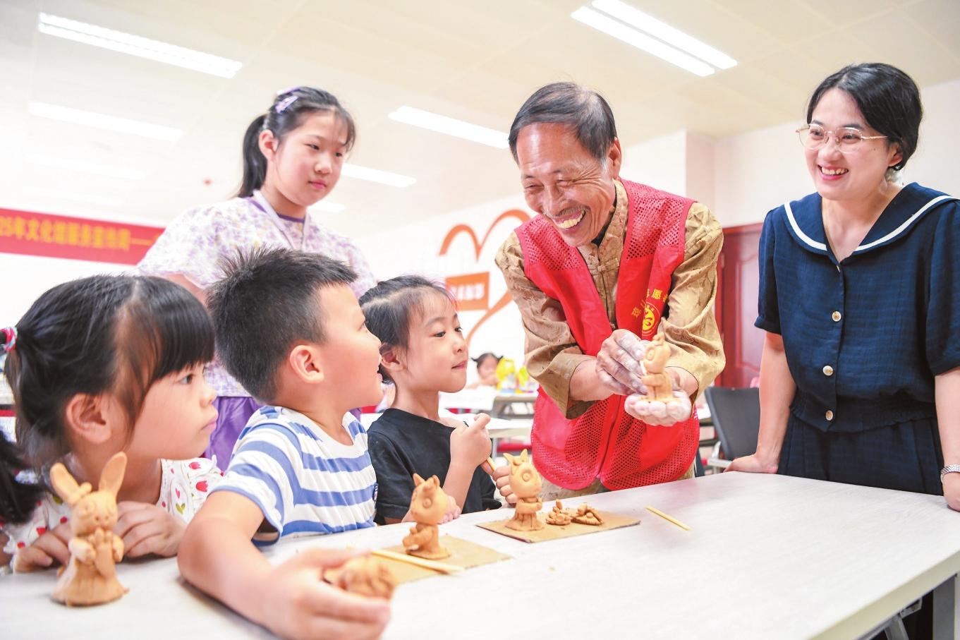 海口瓊山區(qū)文化館內(nèi),海南省非物質(zhì)文化遺產(chǎn)代表性項(xiàng)目龍?zhí)恋?/span>刻藝術(shù)代表性傳承人王科美(右2)指導(dǎo)小朋友制作泥雕。記者 蘇弼坤 攝
